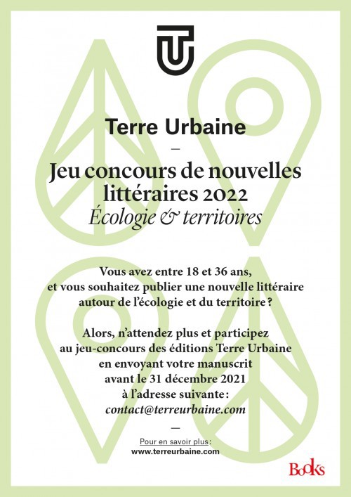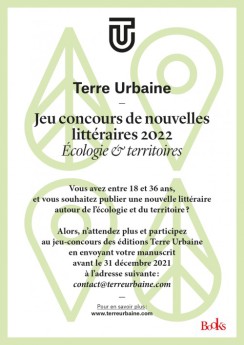Les éditions Terre Urbaine, un petite maison d'édition très active, organise un jeu concours de nouvelles littéraires à destination des jeunes âgés de 18 à moins de 36 ans (https://terreurbaine.com/jeu-concours-2022/). Il s'agit de faire entendre leurs voix, leurs préoccupations et leurs rêves autour de deux mots: écologie et territoire.
